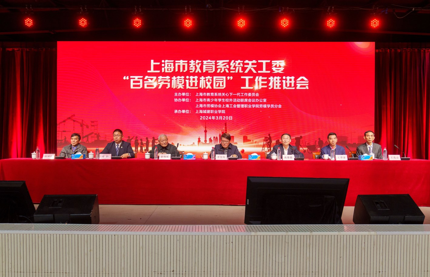 li Xuanhai, Director of the Municipal Education System Committee, Yu Gongqing, Deputy Director of the Committee, Gao Deyi and Chen Qichang, Executive Directors of the Municipal Education System Committee, Shi Rongxin, Deputy Secretary-General of the Municipal Model Workers Association, Tao Lijuan, Deputy Secretary-General and Office Director of the Municipal Model Workers Association, Wang Houfu, Party Secretary of the Shanghai Vocational College of Trade Union Management, Wang Lianyun, President of the Municipal Model Workers Student Branch, Yang Changliang, zou Hong, Director of the Office of the Joint Conference on Out-of-School Activities for Young Students, Chu Min, Secretary of the Party Committee of Shanghai Urban Construction Vocational College, leaders of the “100 Model Workers Entering Campus” twinning colleges, leaders of the Higher Vocational Branch of the Guan Working Committee, leaders of the Education Guan Working Committee of the district where the primary and secondary schools are located, school leaders, students of the sixth model worker class of the Urban Construction College and representatives of twinning students attended the unveiling ceremony and the promotion meeting.