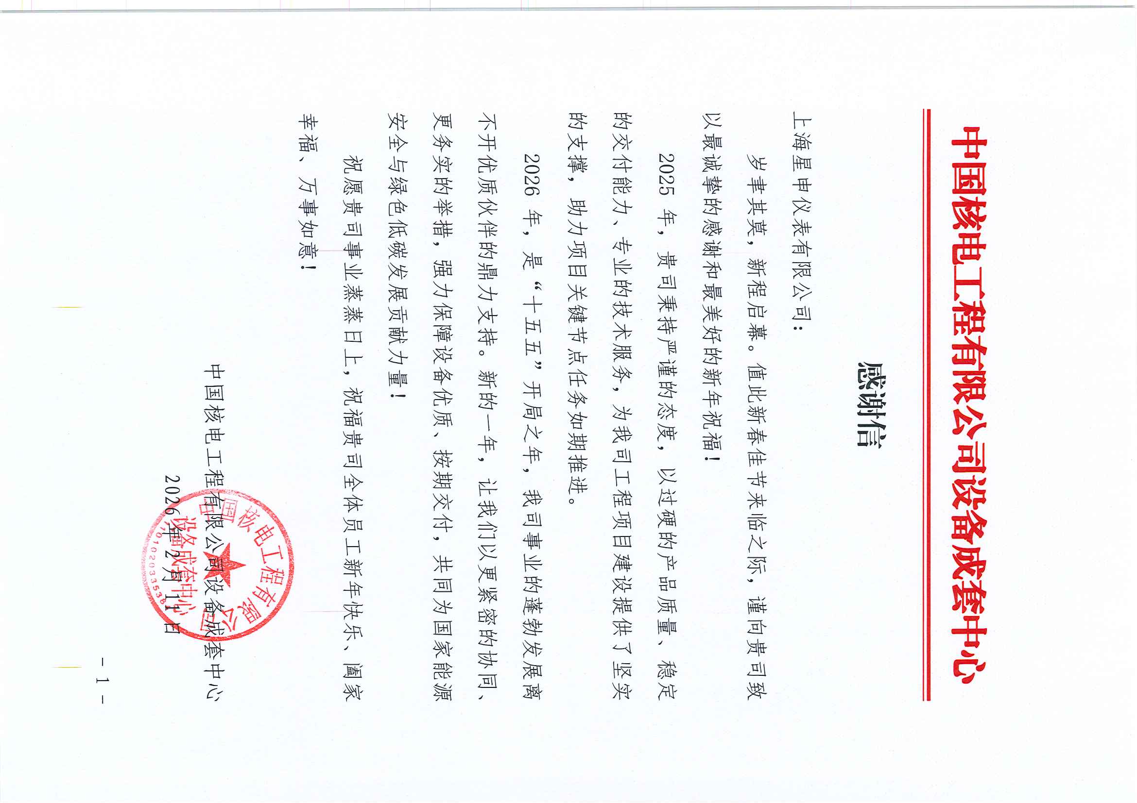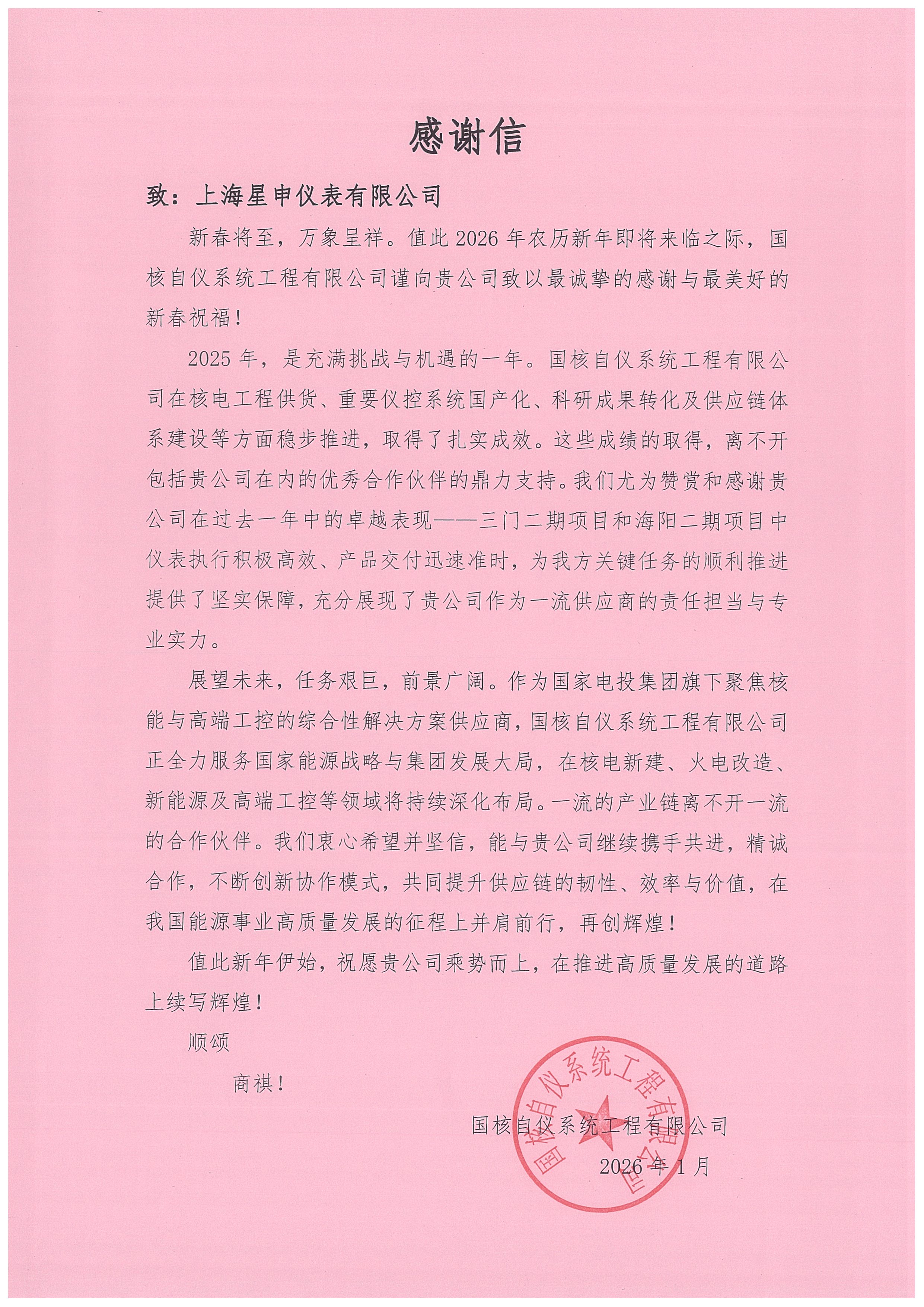 Looking ahead to 2026—the inaugural year of the 15th Five-Year Plan—Shanghai Xingshen Instrument Co., Ltd. will continue to uphold a rigorous approach, constantly enhancing both product quality and service standards. We will work closely in synergy with high-quality partners such as China National Nuclear Corporation Engineering Co., Ltd. and Guohua Self-Regulating Instrument Systems Engineering Co., Ltd., taking more pragmatic measures to ensure timely delivery of top-quality equipment and jointly contributing to national energy security and green, low-carbon development. As we move forward side by side on the journey toward high-quality development of China’s energy sector, we will once again achieve remarkable success.